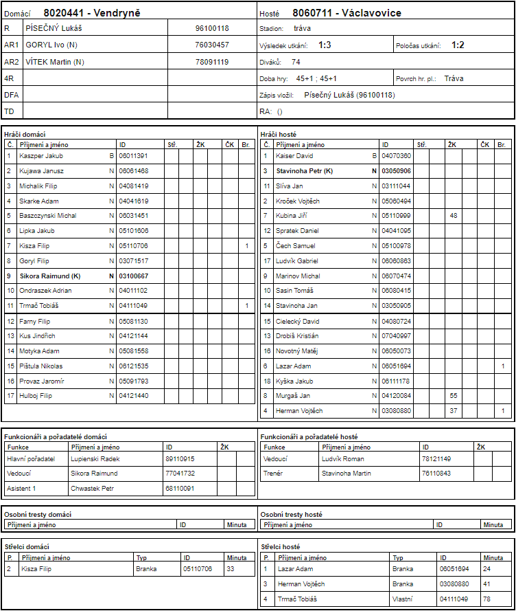 Vendryně - Václavovice 1:3 (1:2)