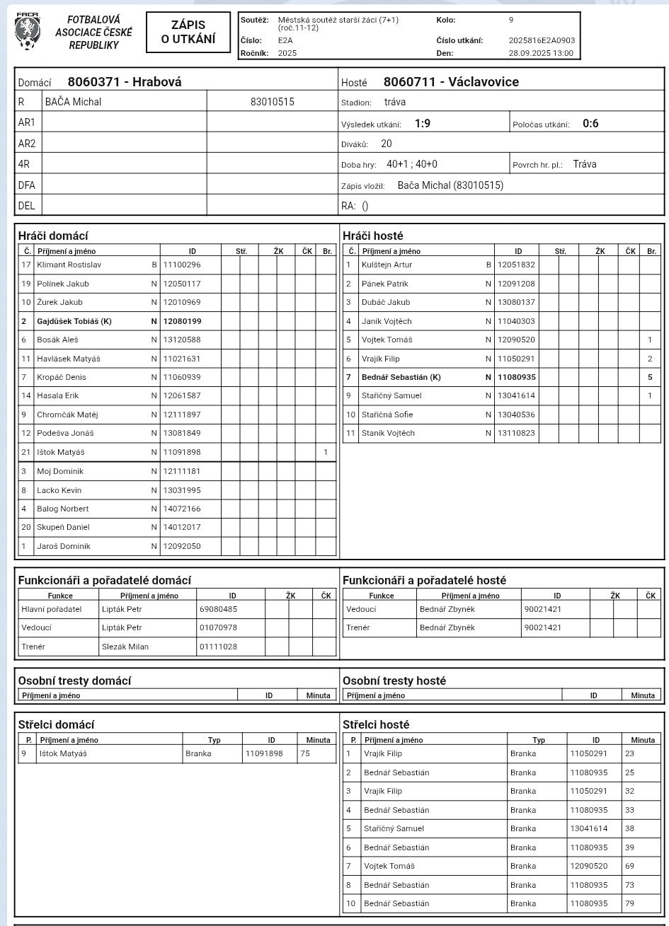 Hrabová U15 - Václavovice U15 1:9 (0:6)