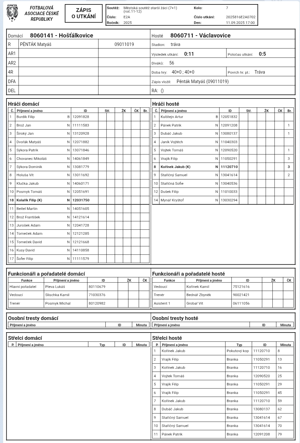 Hošťálkovice U15 - Václavovice U15 0:11 (0:5)